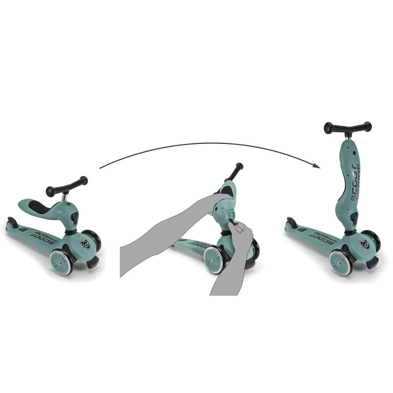U roku od nekoliko sekundi, i bez alata, guralicu možete modifikovati iz sjedećeg položaja, u položaj klasičnog trotineta, na kom dijete stoji i odguruje se.